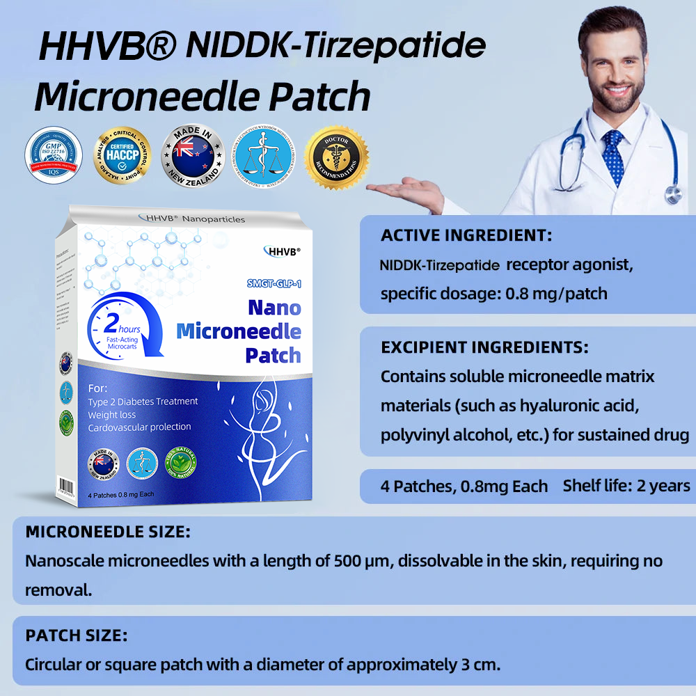 The HHVBยฎNIDDK-Tirzepatideย Nano Microneedle Patch offers a long-lasting. slow release of the medication. ensuring a stable effect over 24 hours without causing any discomfort. With the same dosage and price. it can maintain up to 20 times longer-lasting effects (similar to the difference between an IV drip and a single injection).