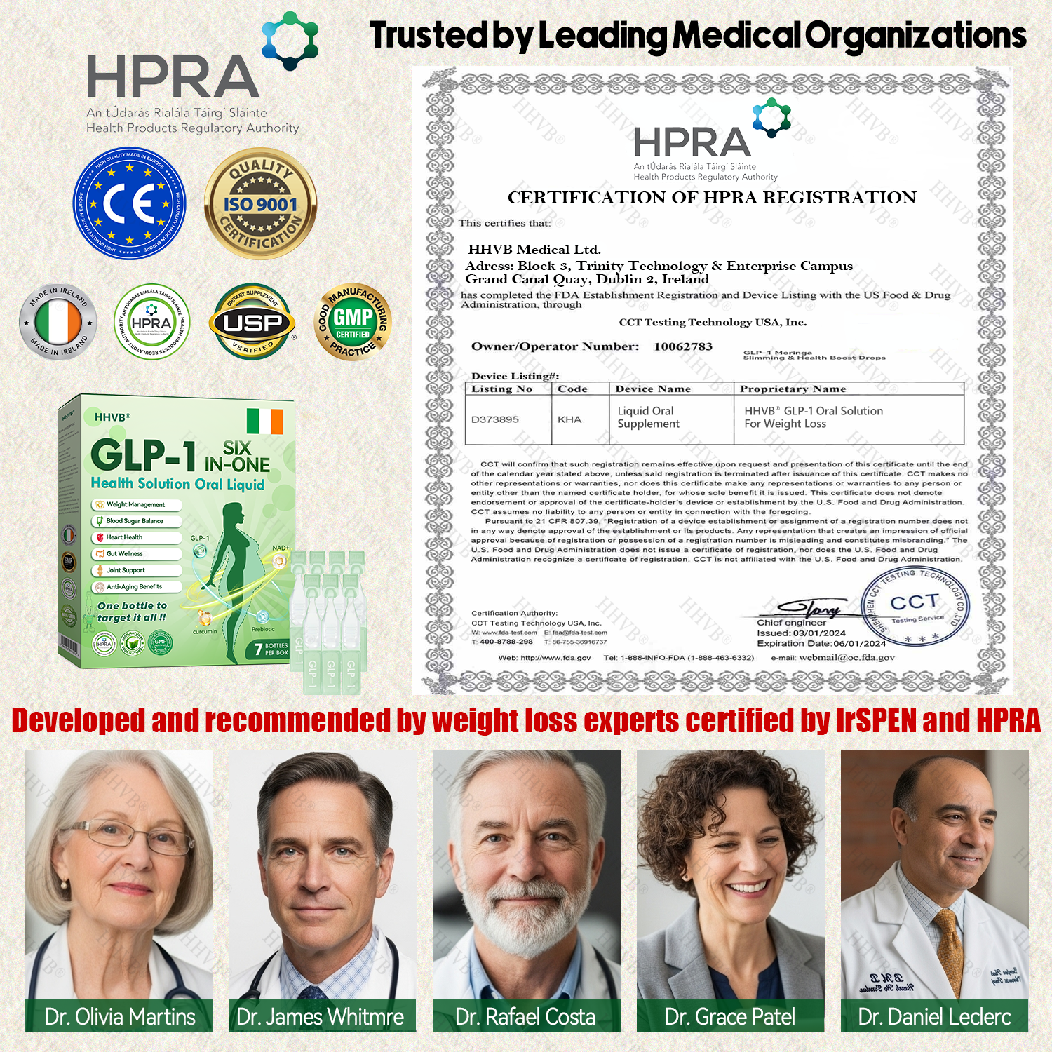 𝐇𝐇𝑽𝑩® 𝐆𝑳𝑷-1 Six in One Health Solution Oral Liquid was developed by a team of over 30 international experts in endocrinology and diabetology after more than 3 years of research. It combines Tirzepatide with powerful herbal ingredients to boost metabolism, accelerate fat burning, and support digestive and lymphatic health. This oral solution has been approved by the Health Products Regulatory Authority (HPRA) in Ireland for its safety and effectiveness, offering a scientifically backed solution for weight management and overall wellness.
